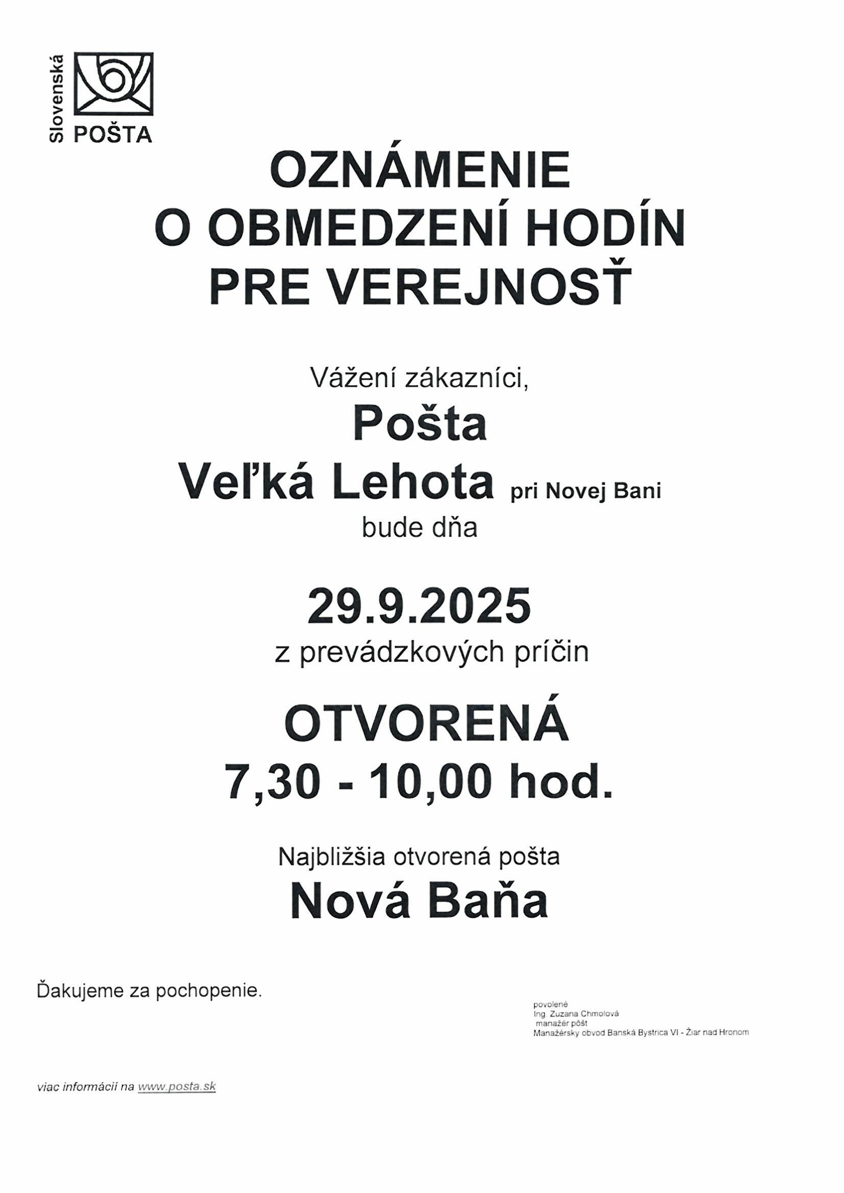 Pošta Veľká Lehota - oznámenie o obmedzení otváracích hodín pre verejnosť