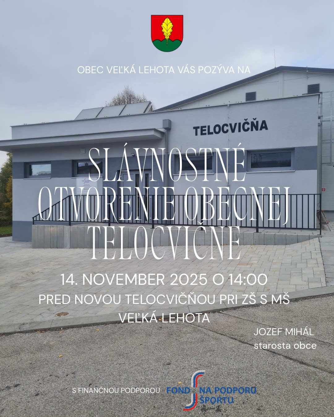 S veľkým potešením všetkým oznamujeme, že nová telocvičňa vo Veľkej Lehote bola skolaudovaná a pozývame vás na jej slávnostné otvorenie v piatok 14.11.2025 o 14:00. Súčasťou otvorenia bude aj posvätenie telocvične pánom farárom, kultúrny program detí a žiakov z našej ZŠ s MŠ Veľká Lehota a ukážka karate zo športového klubu ŠK Karate Nová Baňa. Prvú a jedinú telocvičňu v našej obci sme postavili s finančnou podporou Fondu na podporu športu, ktorému opätovne vyjadrujeme veľkú vďaku.